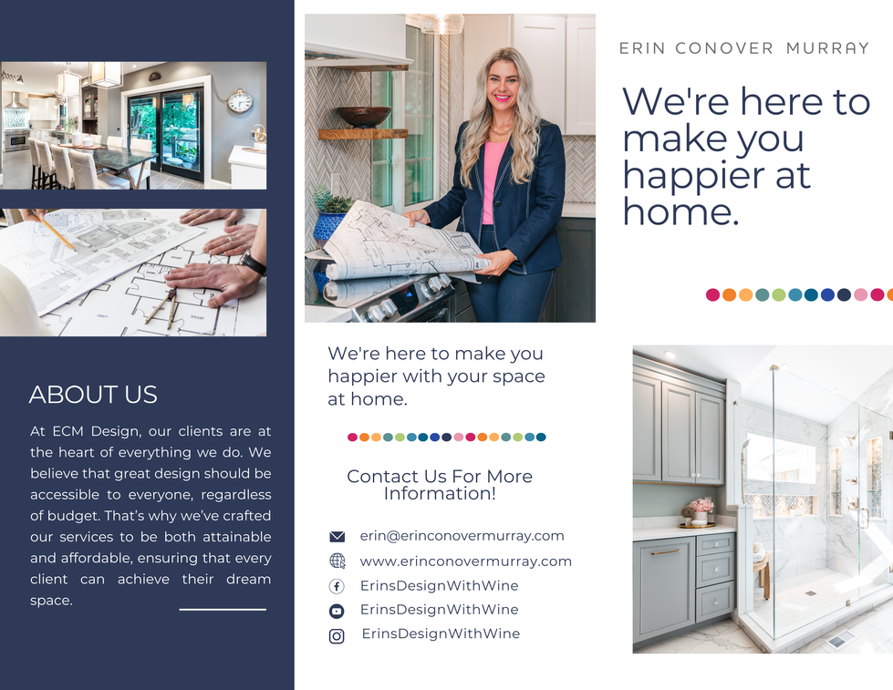 To expand ECM Design’s local presence, I created a brochure for Cincinnati events, serving as a physical marketing piece that introduced potential clients to Erin Conover Murray’s unique design approach. The brochure emphasized affordability, client-focused service, and the transformative power of a one-day Design Facelift, all while reinforcing ECM’s mission to create spaces that bring joy and comfort.